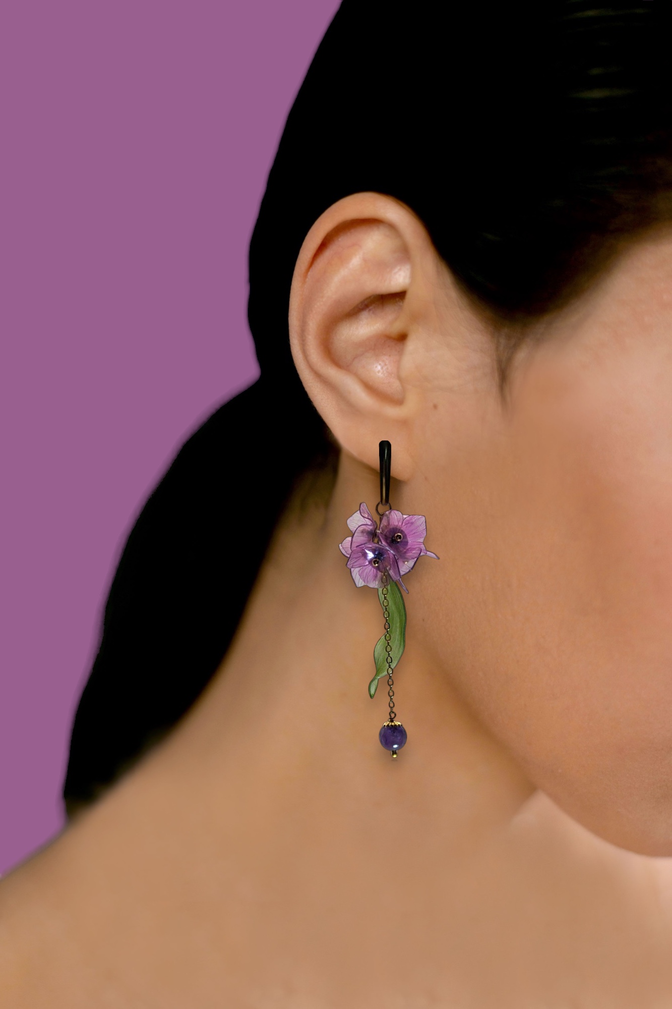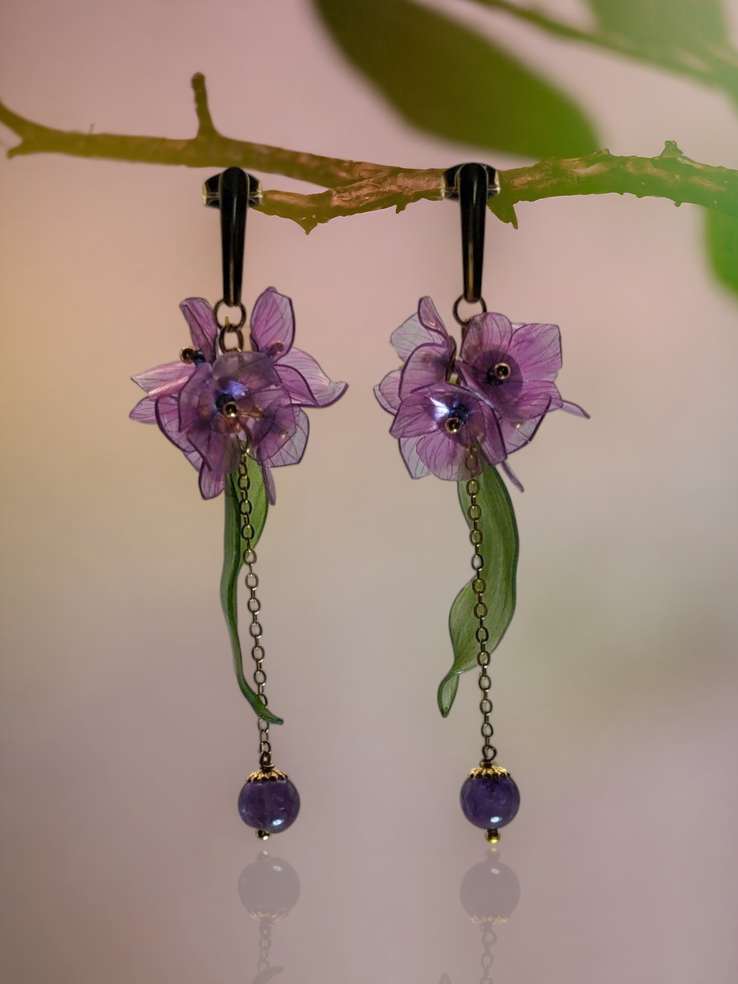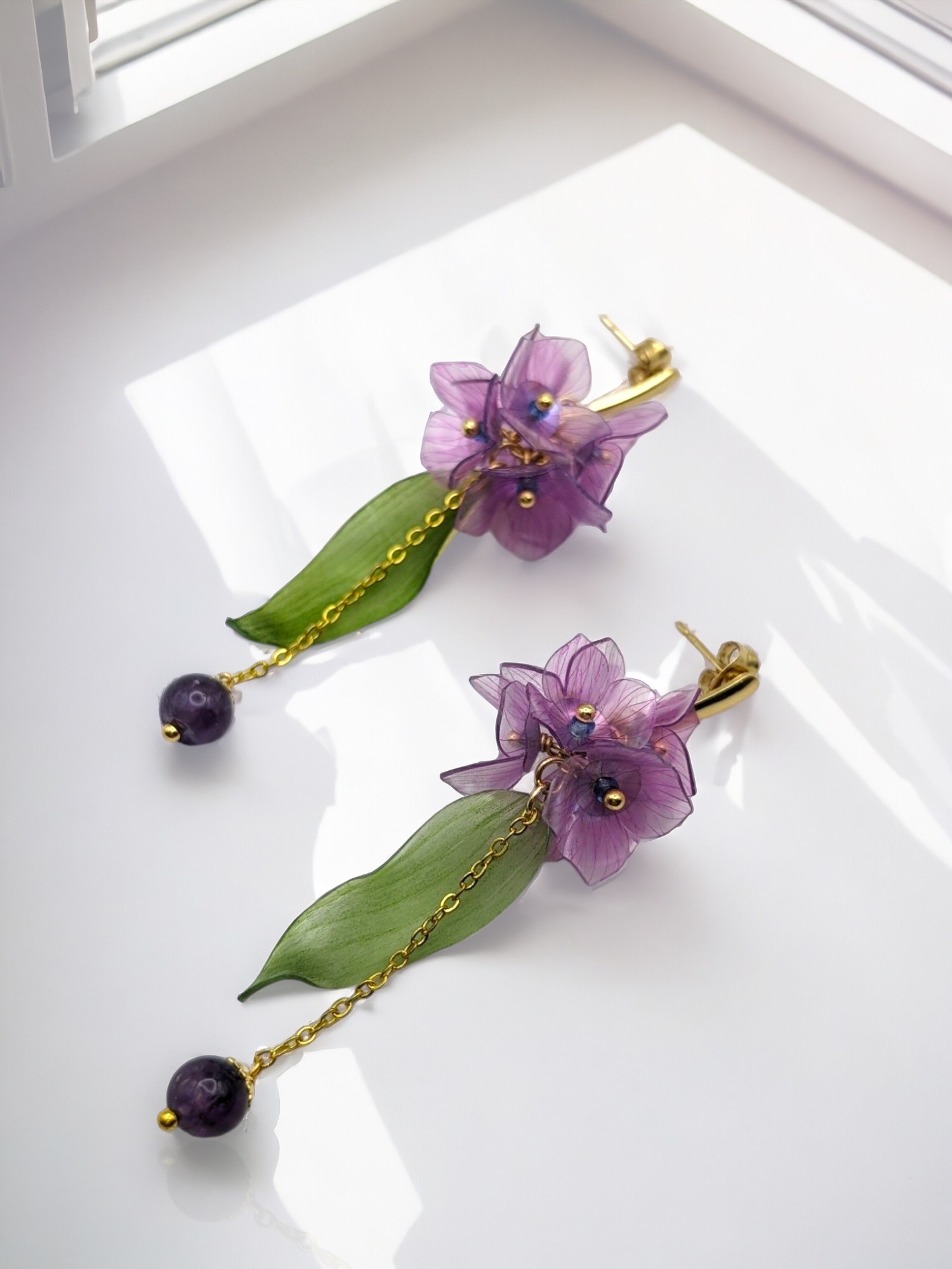 Introducing our “Luxury Purple” earrings, a stunning blend of elegance and sophistication. Each earring features a delicate white plastic hydrangea flower paired with a vibrant green leaf, culminating in a luxurious design. The centerpiece is a lustrous amethyst gemstone, adding a touch of opulence to this exquisite accessory.