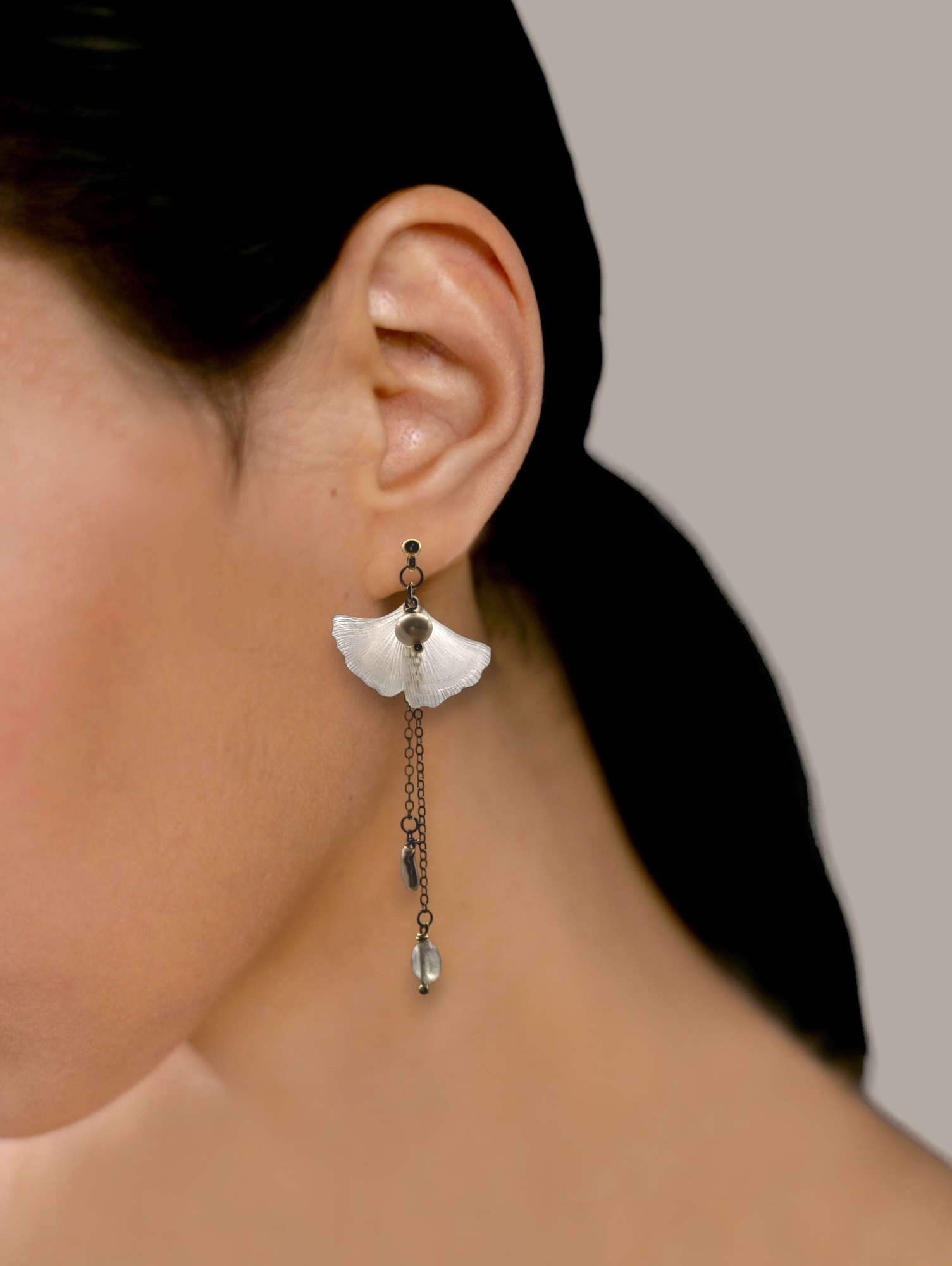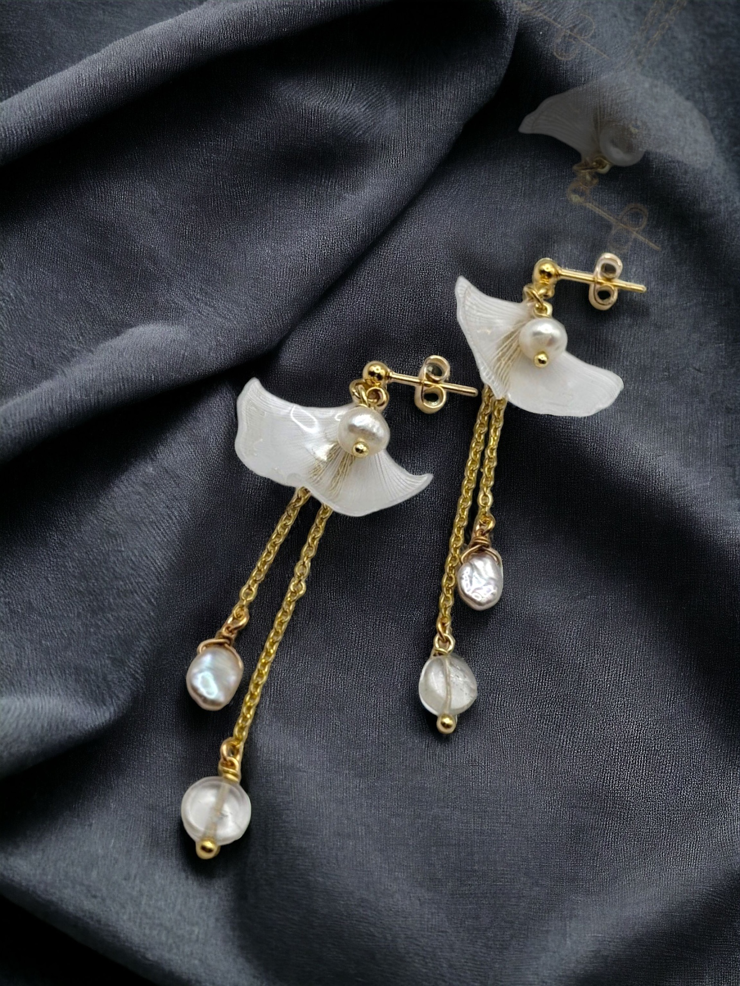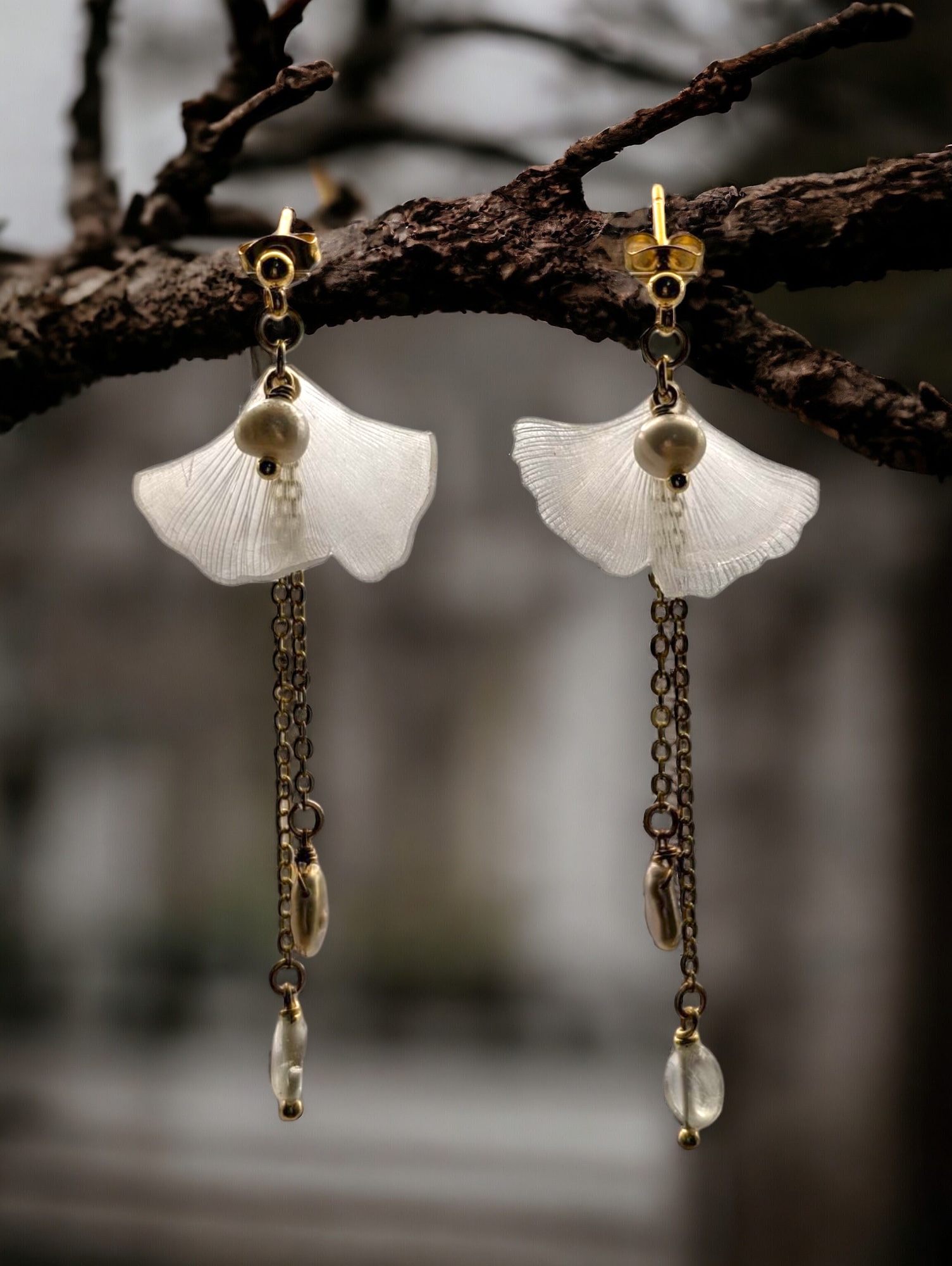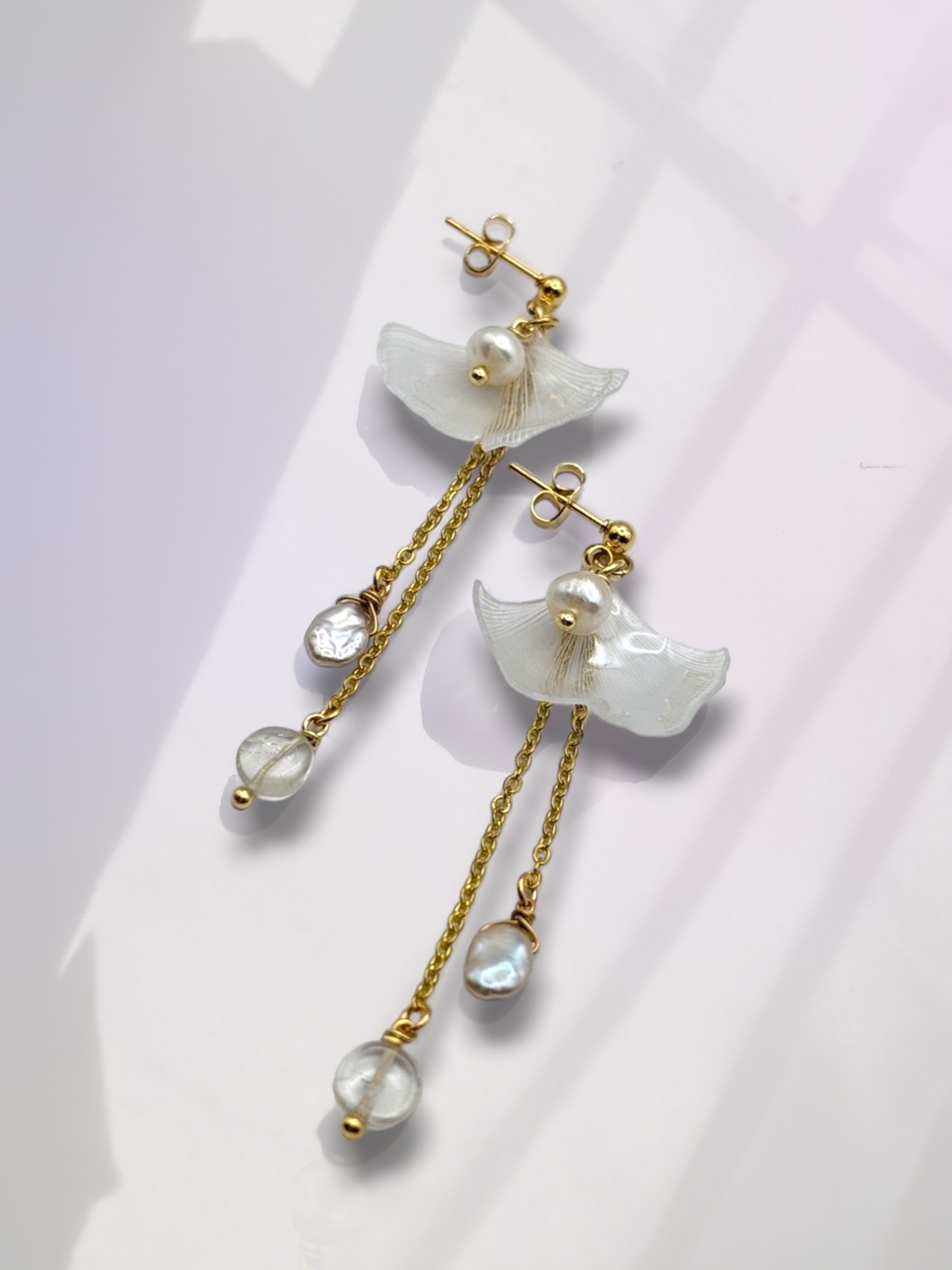 Introducing our “Opalescent” earrings, where the beauty of nature meets the sparkle of elegance. Crafted with delicate white plastic gingko leaves, lustrous pearls, and shimmering crystals, these earrings exude a mesmerizing opalescent glow. Each piece is a stunning representation of ethereal beauty, adding a touch of sophistication and charm to any ensemble.