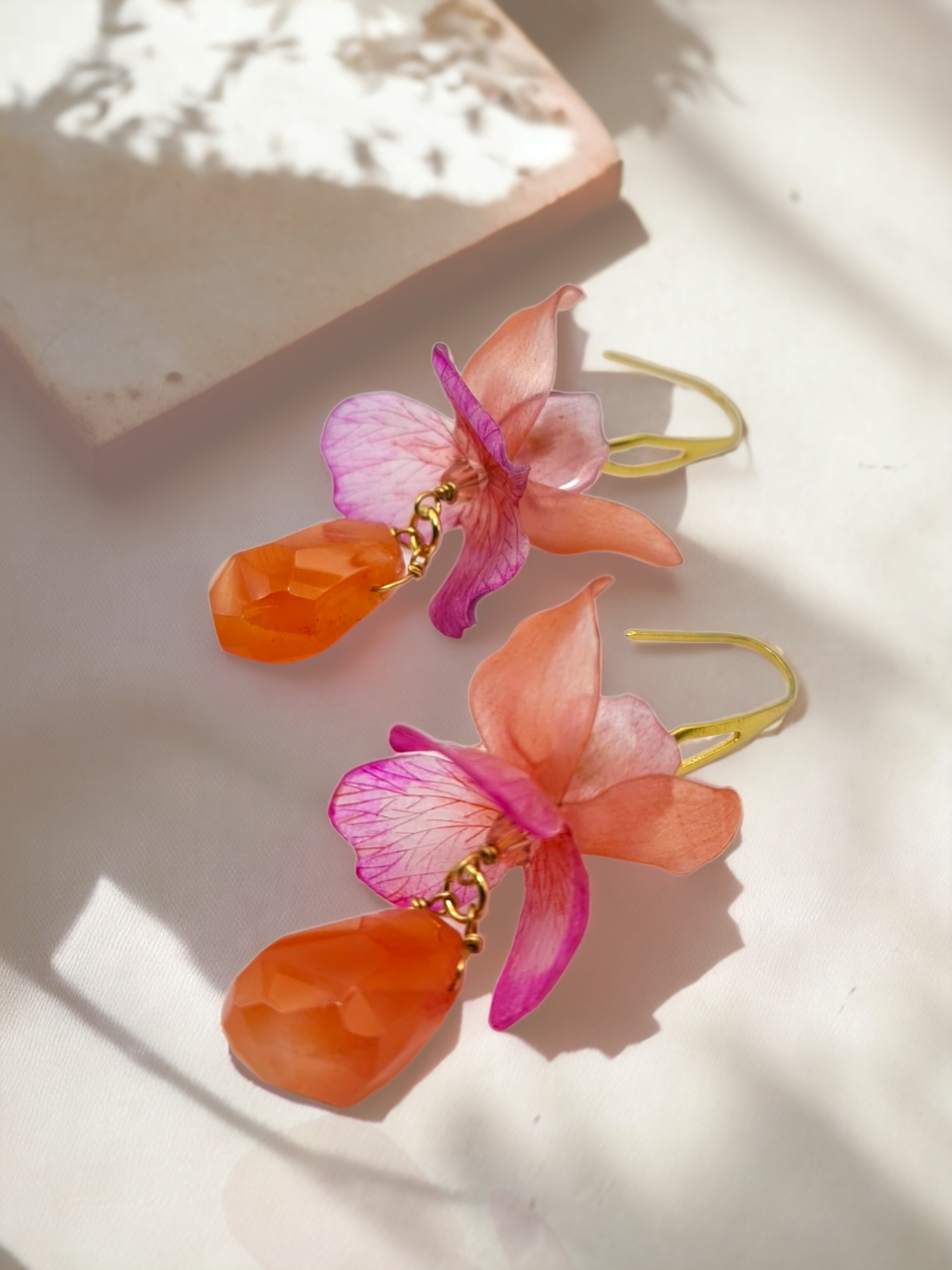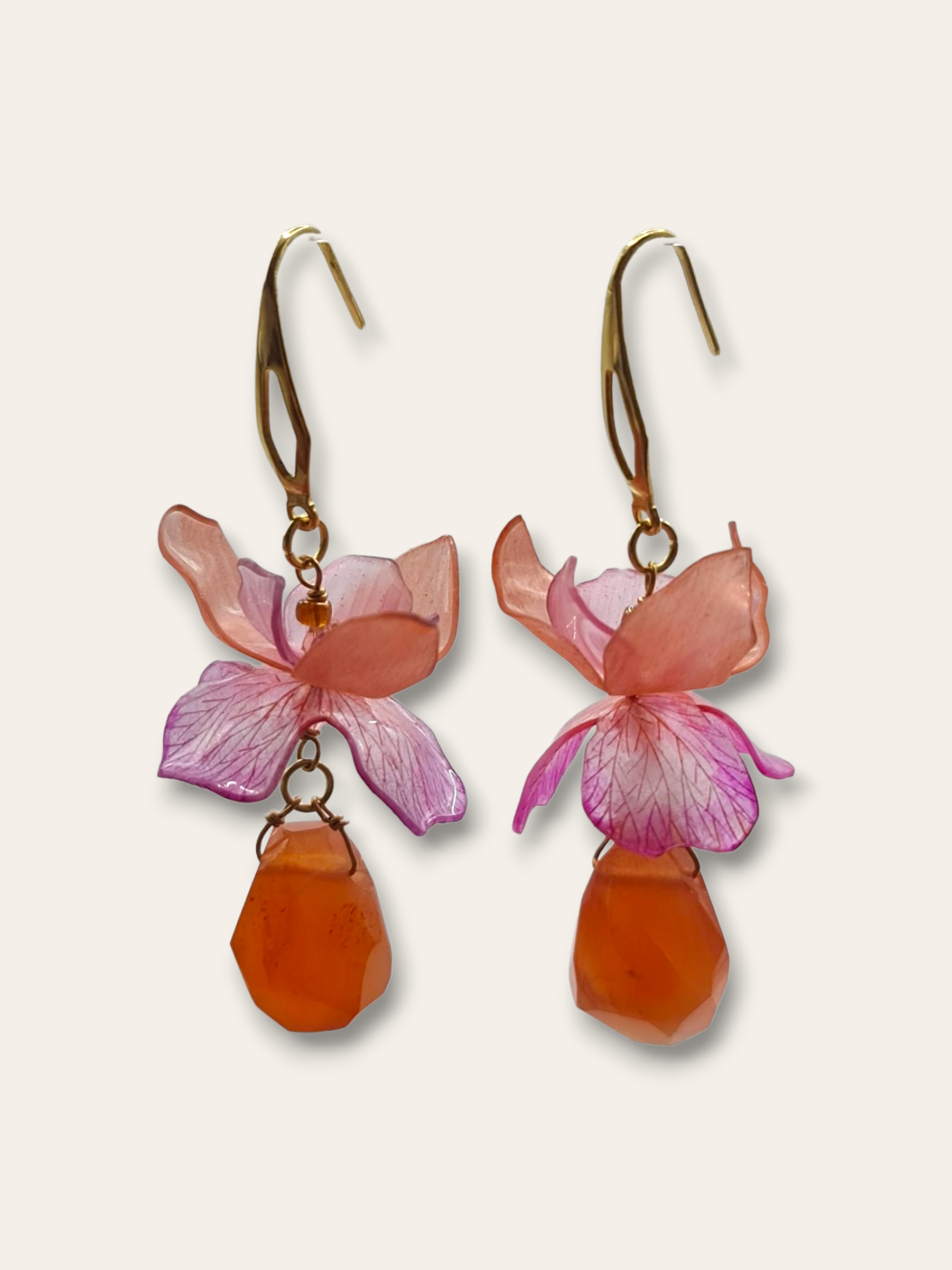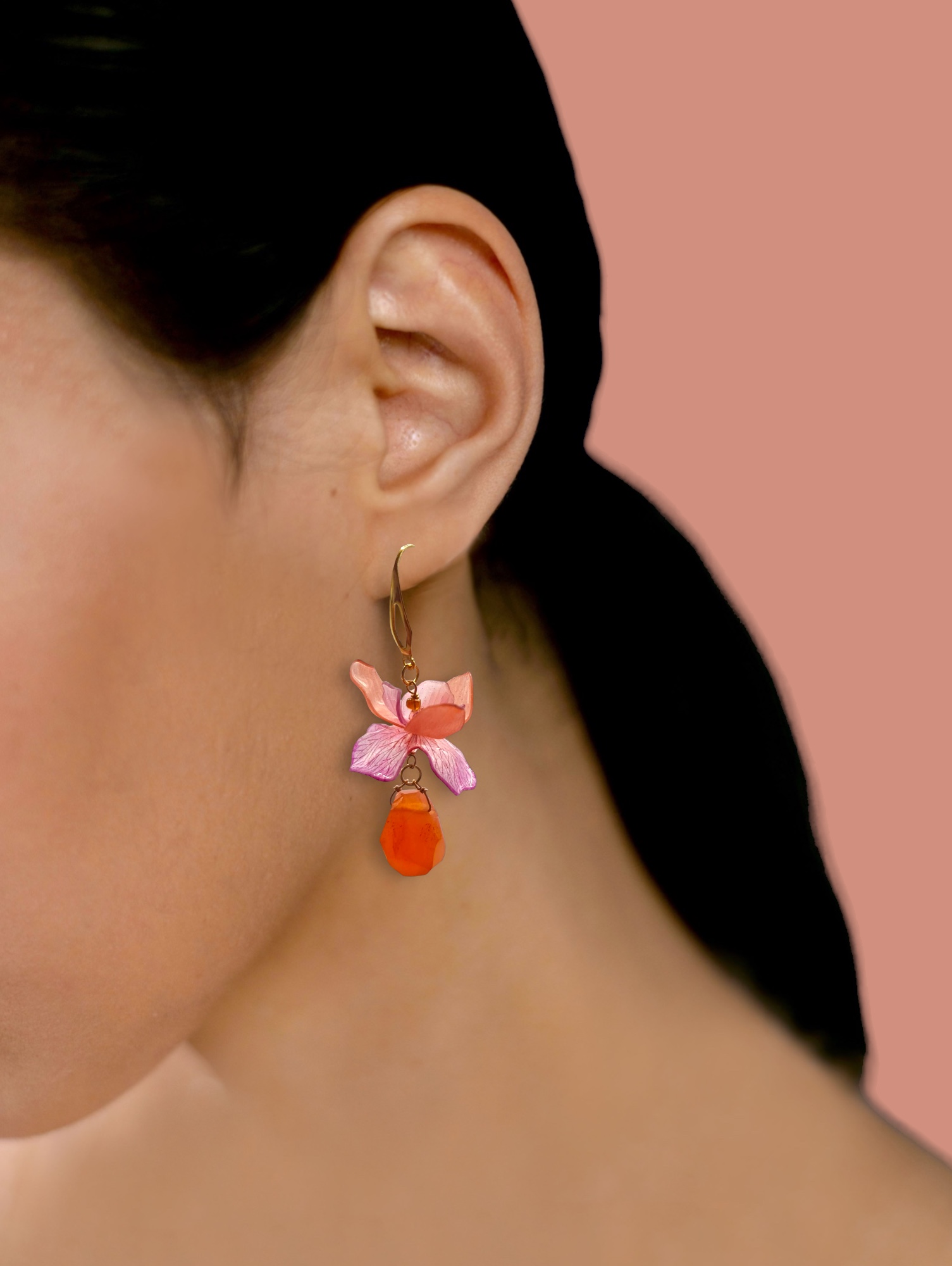 Paired with orange carnelian gemstone, these earrings radiate a warm and inviting glow, reminiscent of a sun-kissed garden.